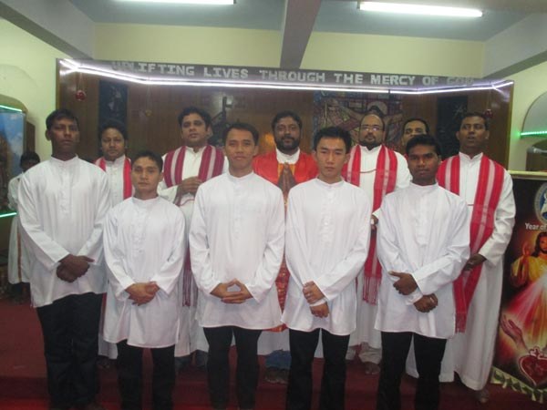 Había varias razones para celebrar: cinco hermanos comenzaron el año canónico del noviciado: Avinash S. y Pobitro Minji (Vicariato de la India), Matthew, Peter y Panupan (Vicariato de Tailandia). La Eucaristía de la noche fue presidida por el P. Biju Paul Alappat scj, Vicario Regional de la India, la homilía fue pronunciada por el P. Sebastián Subes scj, y el P. Biju Antony Panthalookaran scj, maestro de los novicios, recibió oficialmente a los novicios. El P. John Britto scj, el P. George Mathew scj y el Padre Pascal Ravi scj concelebraron la Eucaristía y oraron por sus jóvenes hermanos.