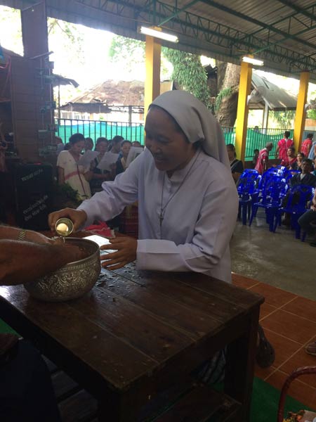 La iglesia estaba atestada, los cantos particularmente solemnes, la atmósfera alegre y llena de emoción. Después de la misa, después del saludo de los hermanos y de las autoridades locales, el P. Ugo se dirigió a los feligreses, animándoles a seguir dando testimonio de su fe en Jesús. Más tarde, en el salón parroquial, cada feligrés saludó el P. Ugo Donini, vertiendo en sus manos un agua mezclada con algunas hierbas aromáticas. Este gesto, típico de la cultura kariana, indica el pedido de perdón y la invocación de la bendición del Señor. Toda la congregación Betharramita expresa al P. Ugo su agradecimiento por los muchos años de misión, que son un valioso legado entregado a los jóvenes religiosos del Vicariato de Tailandia.